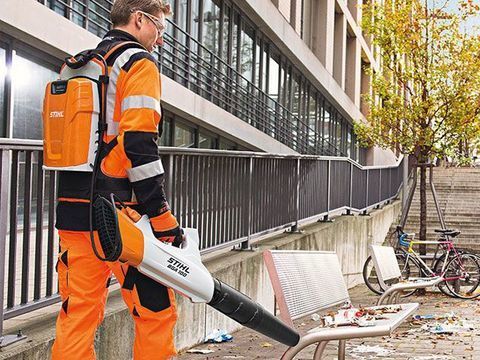 Silencioso, ligero soplador potente de acumulador para el profesional, para el uso en zonas sensibles al ruido, tubo redondo, manillar de goma de dos componentes, tres posiciones de soplado y además una posición turbo. Tubo de soplado regulable en longitud. Gancho para el apoyo acolchado, peso 2,5 Kg.